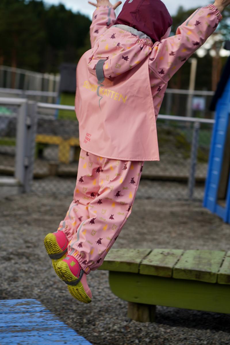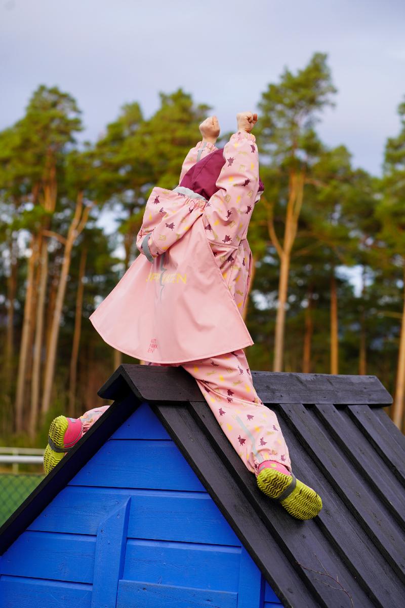 Her blir regnvêrsdagar til superhelt-trening på ekte vis: spring for fort, hopp for langt og le litt for høgt (sorry, naboar). Dressen held barnet tørt og varmt, medan fantasien tek over og reglane blir litt mjukare. Ein ekte kvardagshelt i garderoben – klar frå første plask til siste triumferande sprang heim, året rundt.