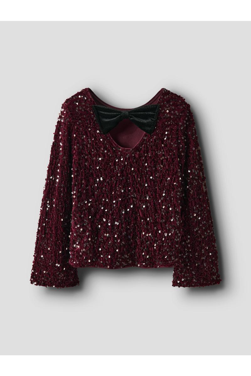 Bli klar til alle festligheter og anledninger i denne super søte blusen. Fine sløyfedetaljer i nakke/rygg og full i paljetter som gir det lille elstra til hele antrekket.